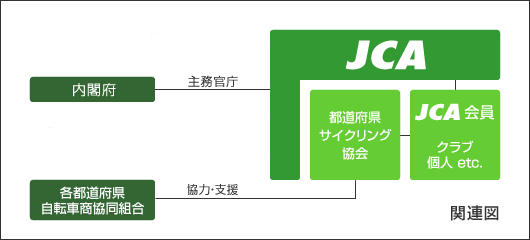 昭和36年(1961年)、「スポーツの振興法」の制定によりサイクリングは国民の心身の健全化に有効なスポーツとして 国が奨励することが明文化されたのを契機に、昭和39年(1964年)に文部大臣(現文部科学大臣)から、サイクリングの普及推進を目的とする 公益事業を行う財団法人として認可され、「 財団法人日本サイクリング協会 (略称JCA = JAPAN CYCLING ASSOCIATION) 」が設立されました。