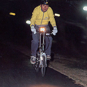 スポークやペダル、足など動く場所に反射鏡をつけると目立って効果的です。また強力な発光をするLEDタイプのものが視認性が高く安全です。(足が空回りしない程度)を選べば、疲労を防げます。